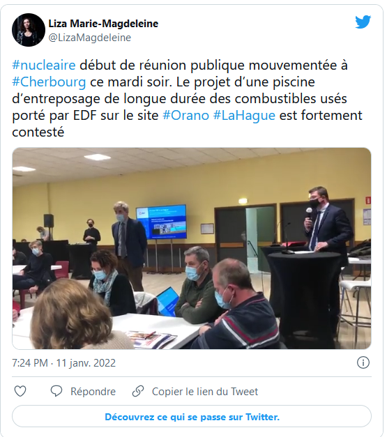 D’entrée de jeu, le débat promettait d’être houleux, à Cherbourg (Manche). Ce mardi 11 janvier 2022, la réunion de concertation portant sur le projet de piscine d’EDF, qui veut entreposer à La Hague les combustibles usés de toutes les centrales nucléaires françaises, est sortie des rails.